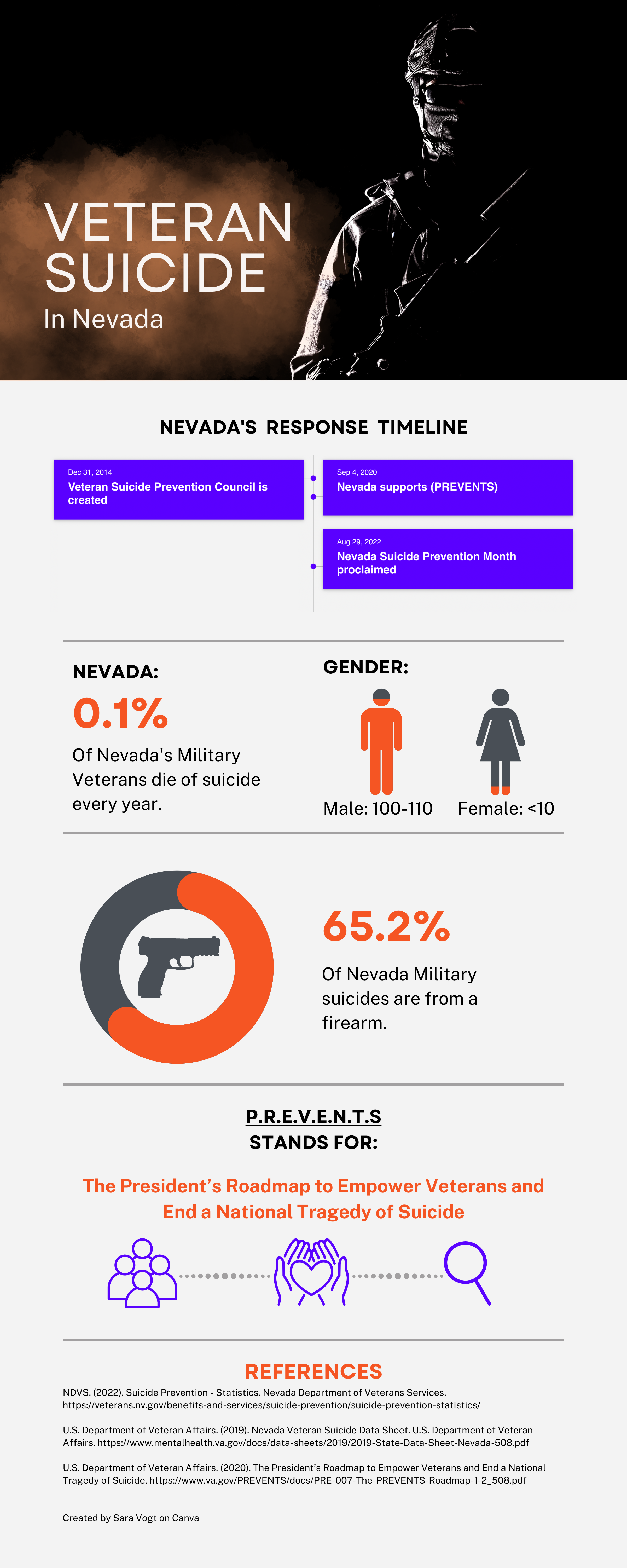 As of 2018, the Mayor and Governor have implemented Suicide Awareness Challenges that encourage 24 different cities to participate in suicide prevention for military veterans. The main priorities of the challenge include screening for suicide risk, fostering community, and striving for safety plans. On September 4th, 2020, Sisolak also signed a proclamation declaring Nevada’s support for the President’s Roadmap to Empower Veterans and End a National Tragedy of Suicide (PREVENTS) to help veterans prioritize mental health. PREVENTS is part of the VA’s REACH program that gives support and resources to those in need.