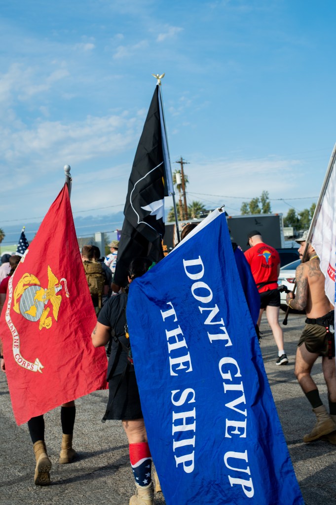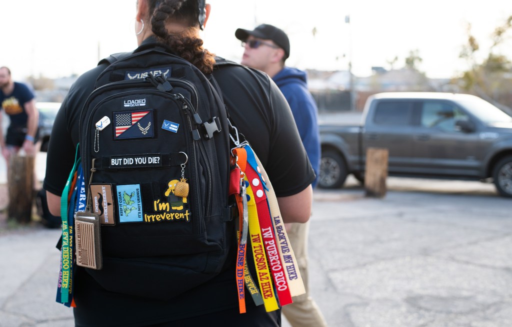 Around 90 veterans attended the hike, many toting patriotic flags and wearing military and American flag-themed outfits. Veterans of the event were easy to spot, their ruck-sacks and backpacks covered in lanyards from previous hikes. Some attendees even carried boomboxes on their shoulders, blasting classic tunes throughout the walk.